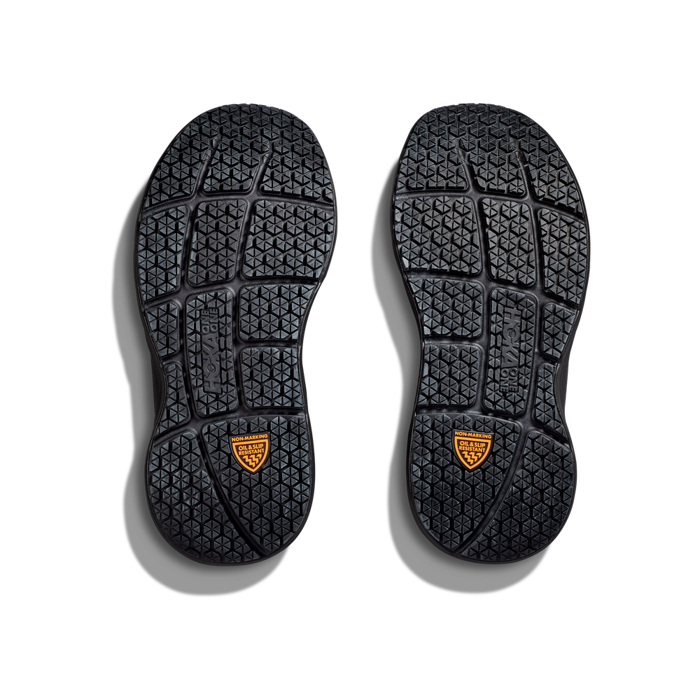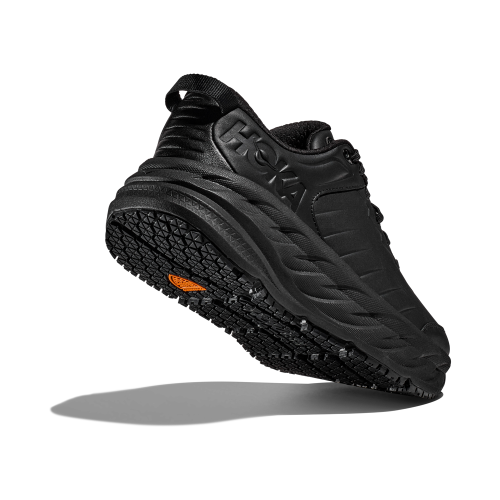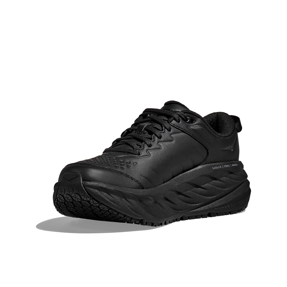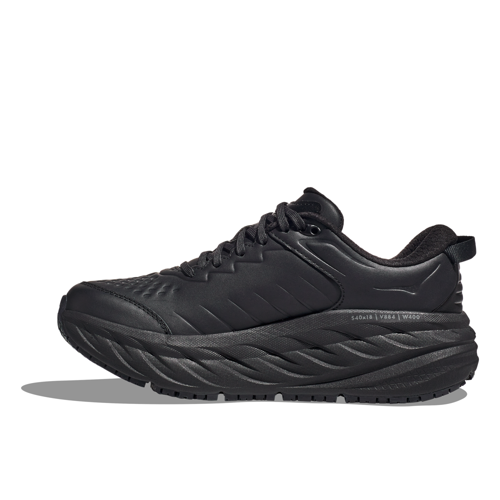 Comfort that works overtime. The Bondi SR takes the most cushioned shoe in the HOKA road-shoe lineup and reworks the silhouette to handle the demands of daily life. Updated with water-resistant leather, a slip-resistant outsole and EVA midsole to ensure all-day cushion, this workplace warrior features an ultra-grippy, full ground contact rubber that stands up to the demands of the service industry and medical field alike.