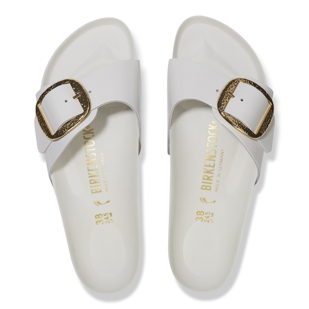 The BIRKENSTOCK Madrid is the oldest member of the family of models, making it a veritable classic. Launched as a “gymnastics sandal” half a century ago, this simple single-strap model has gone on to become a firm fashion favorite. The Big Buckle Hammered version is unmistakable with its large, elegant pin buckles and hand-hammered design. An impressive and distinctive eye-catcher on this otherwise understated sandal. The upper is made from high-quality natural leather with a shiny patent coating.